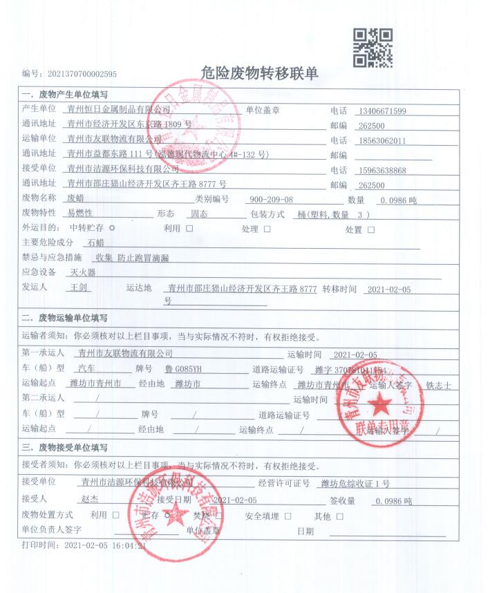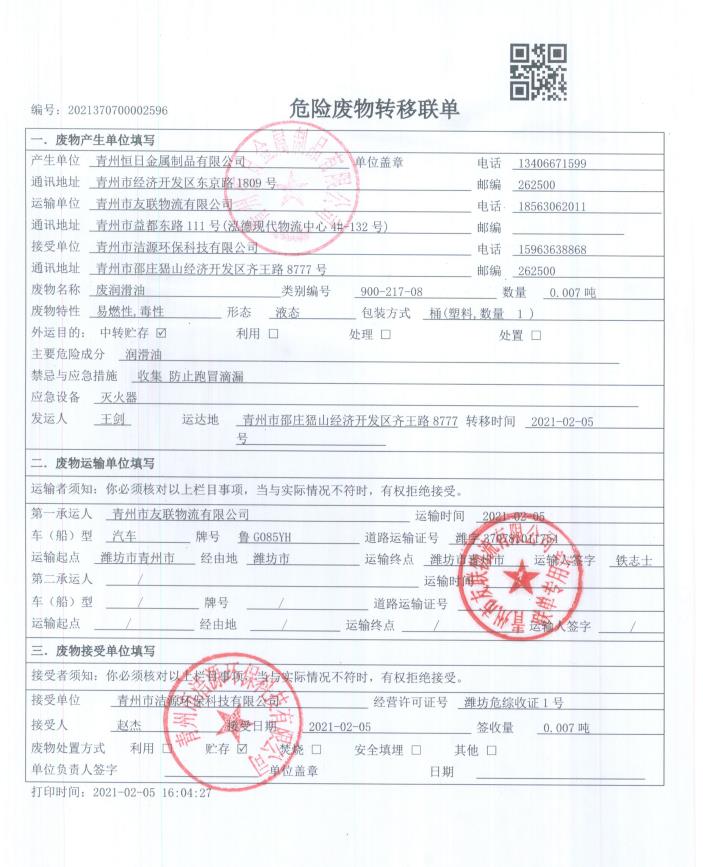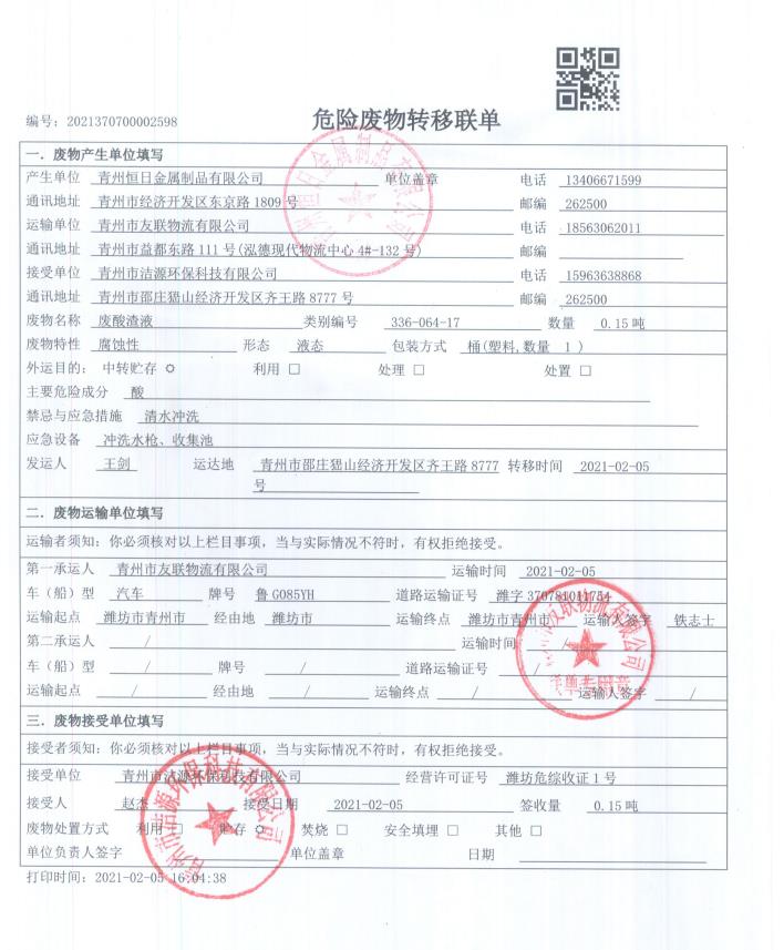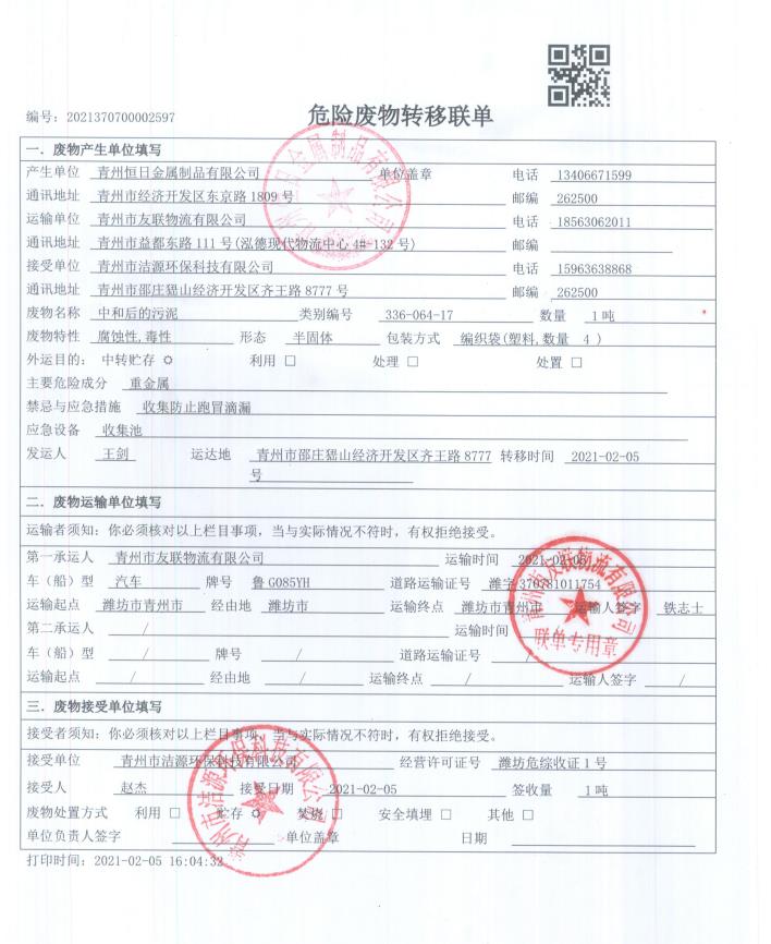 青州恒日2021危廢處置聯(lián)單